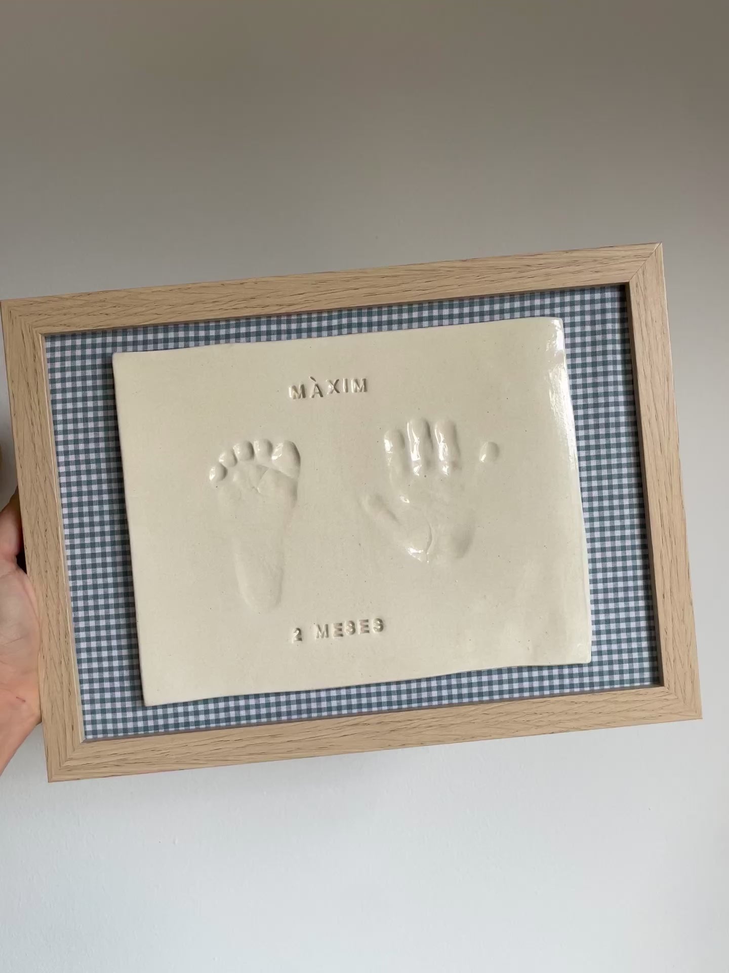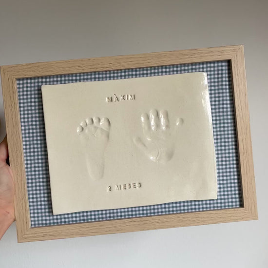 KIT COMPLETO Azul Incluye: 500gr aprox de Arcilla blanca de secado al aire, instrucciones de uso, rodillo, esponja, cortador, letras, marco, pincel, barniz y tela azul cuadros.