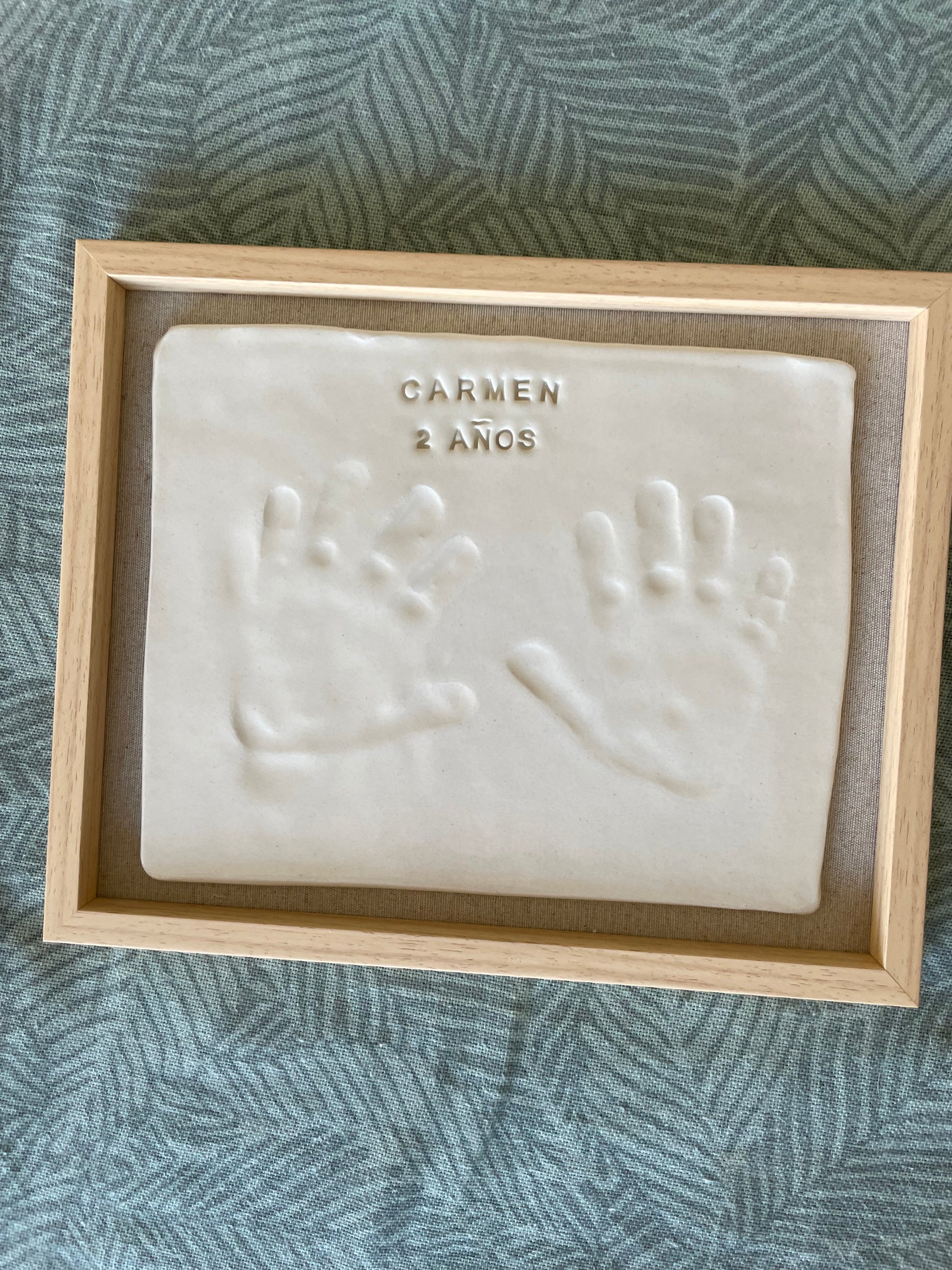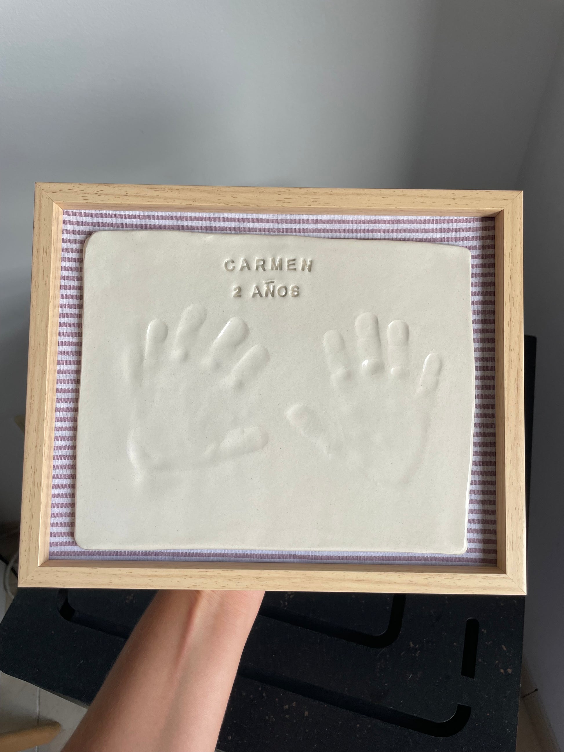 KIT TELA Incluye: 250gr. aprox. de arcilla blanca de secado al aire, instrucciones de uso, rodillo, esponja, cortador, marco, pincel, letras y tela a elegir (rayas rosa, azul cuadros o beige natural).
