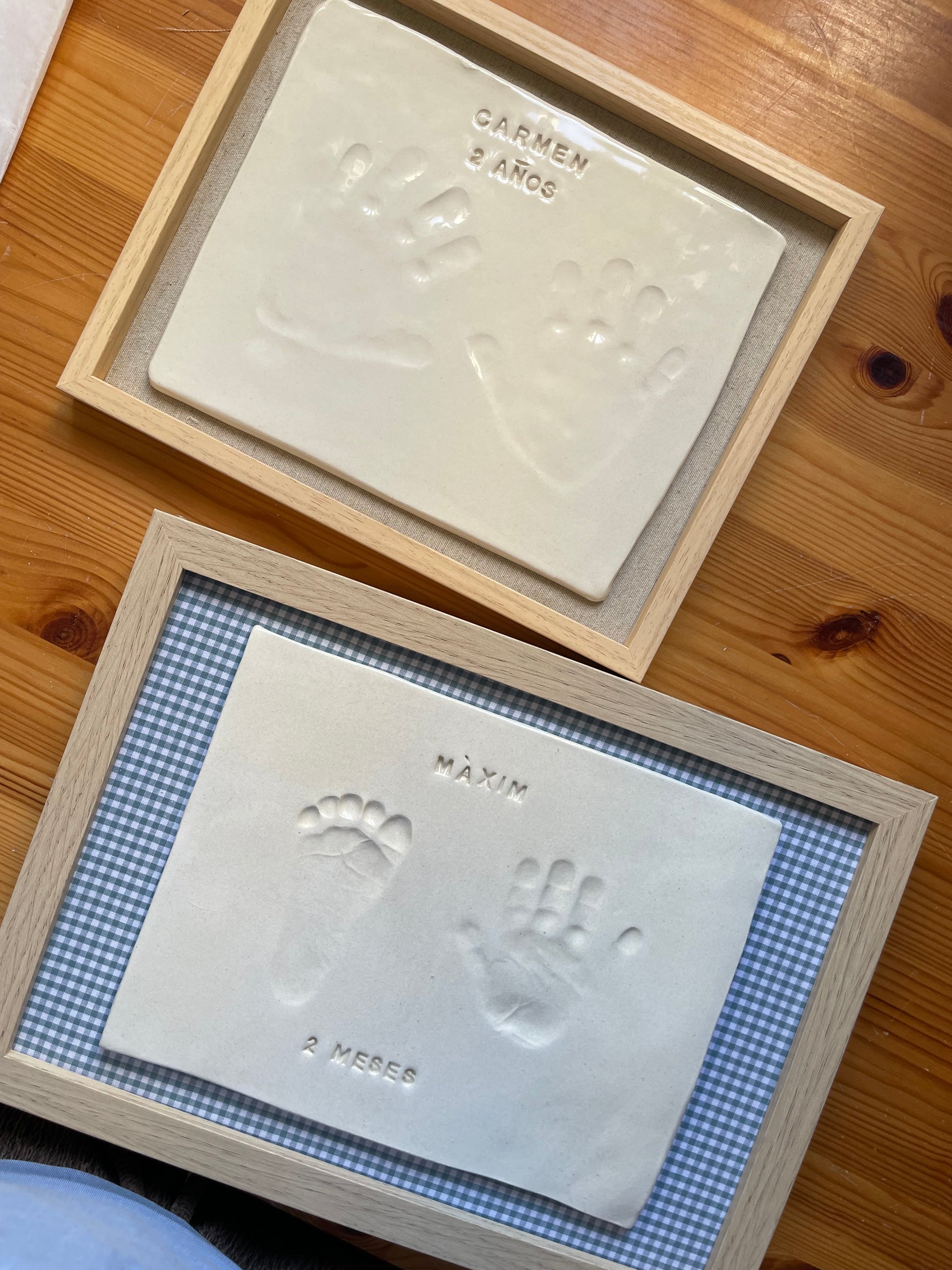 KIT COMPLETO Incluye: 250gr. aprox. de arcilla blanca de secado al aire, instrucciones de uso, rodillo, esponja, cortador, pincel, marco, letras, tela a elegir (rayas rosa, azul cuadros o beige natural) y barniz acabado brillo.