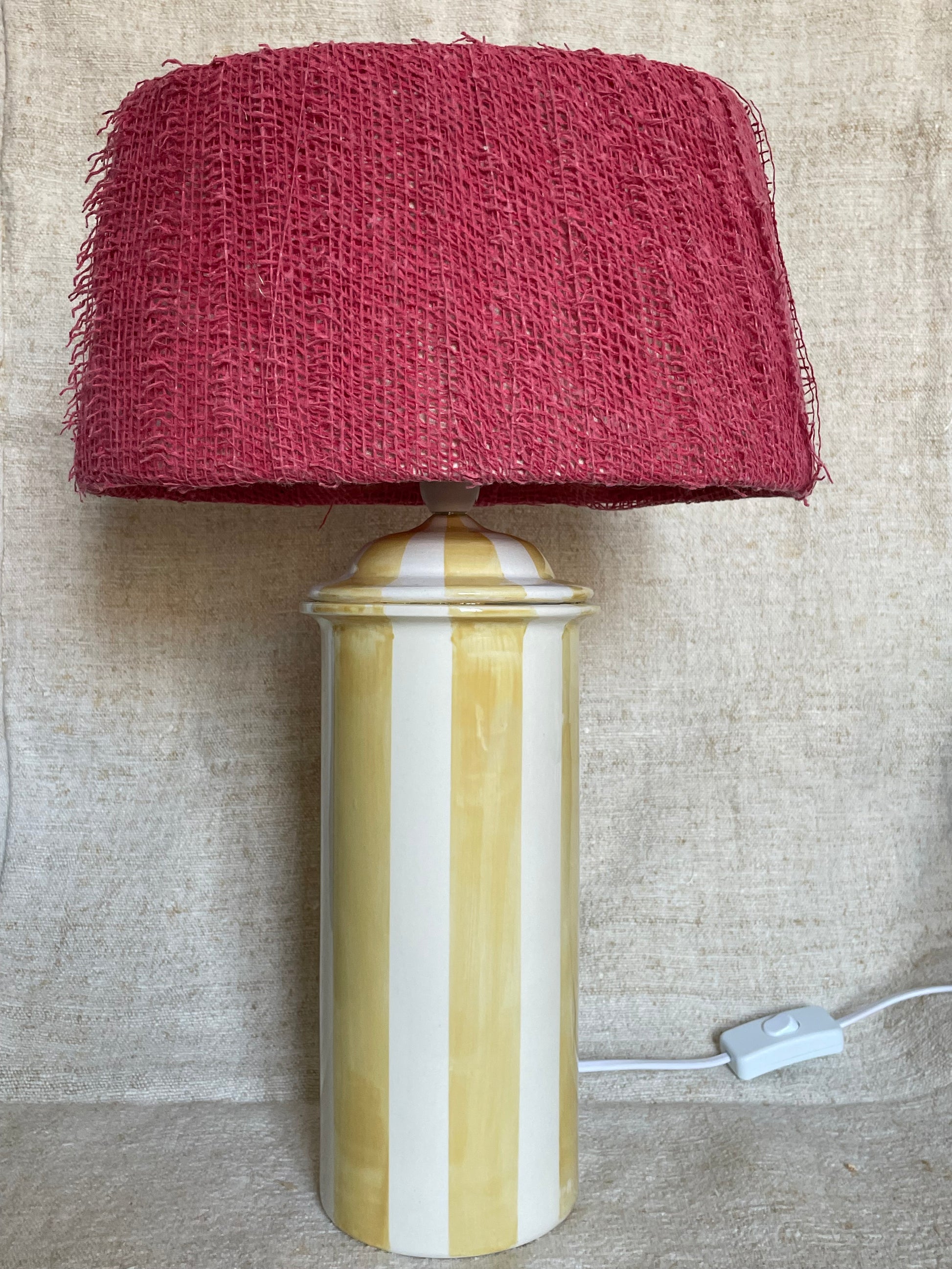 Lámpara hecha a mano en loza blanca, vitrificada con esmalte reactivo de Amarillo, mediante un proceso de bicocción a baja temperatura 1020 grados.