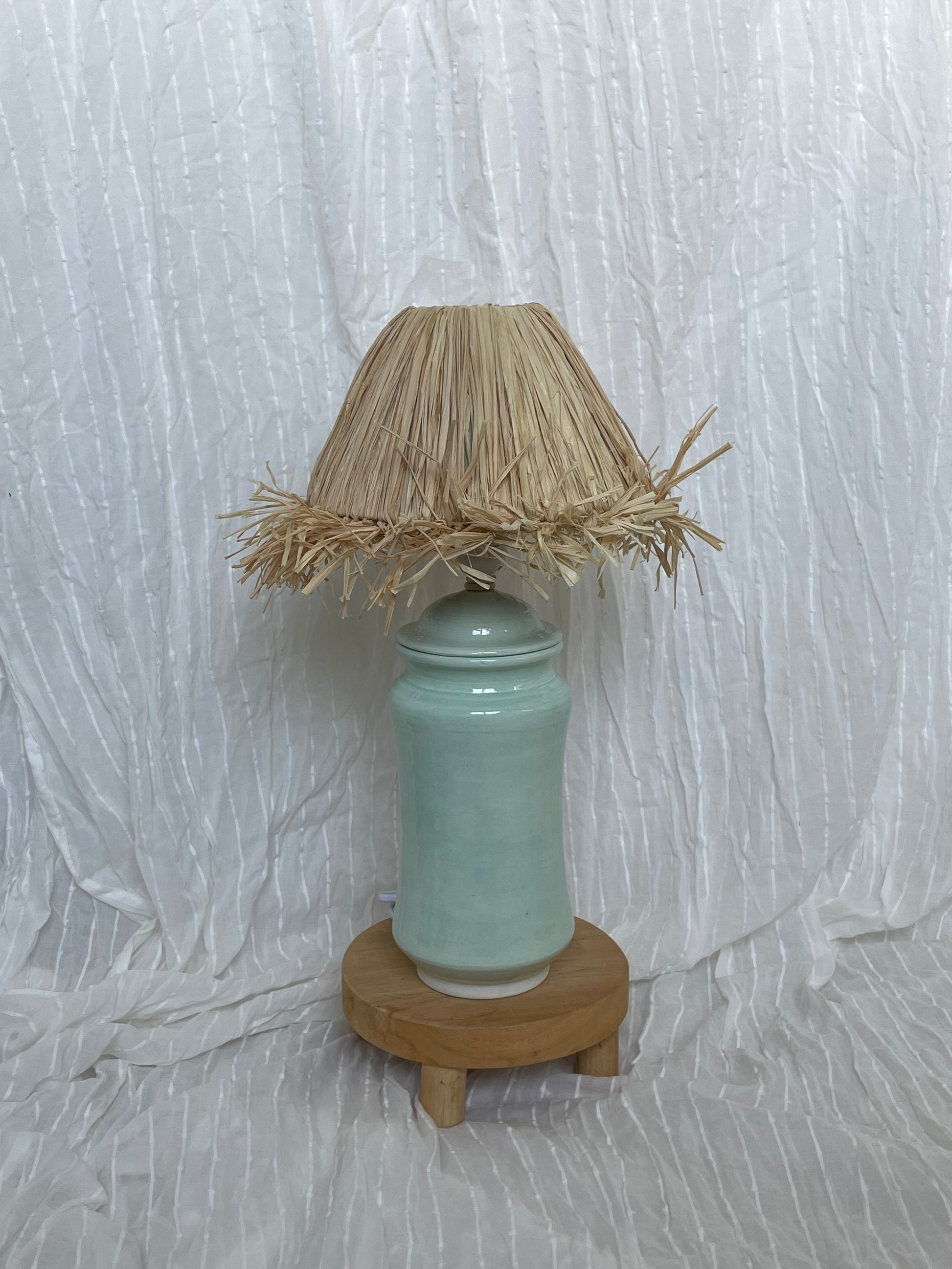 Pantalla hecha a mano nudo a nudo con rafia natural, dándole ese toque de personalidad.