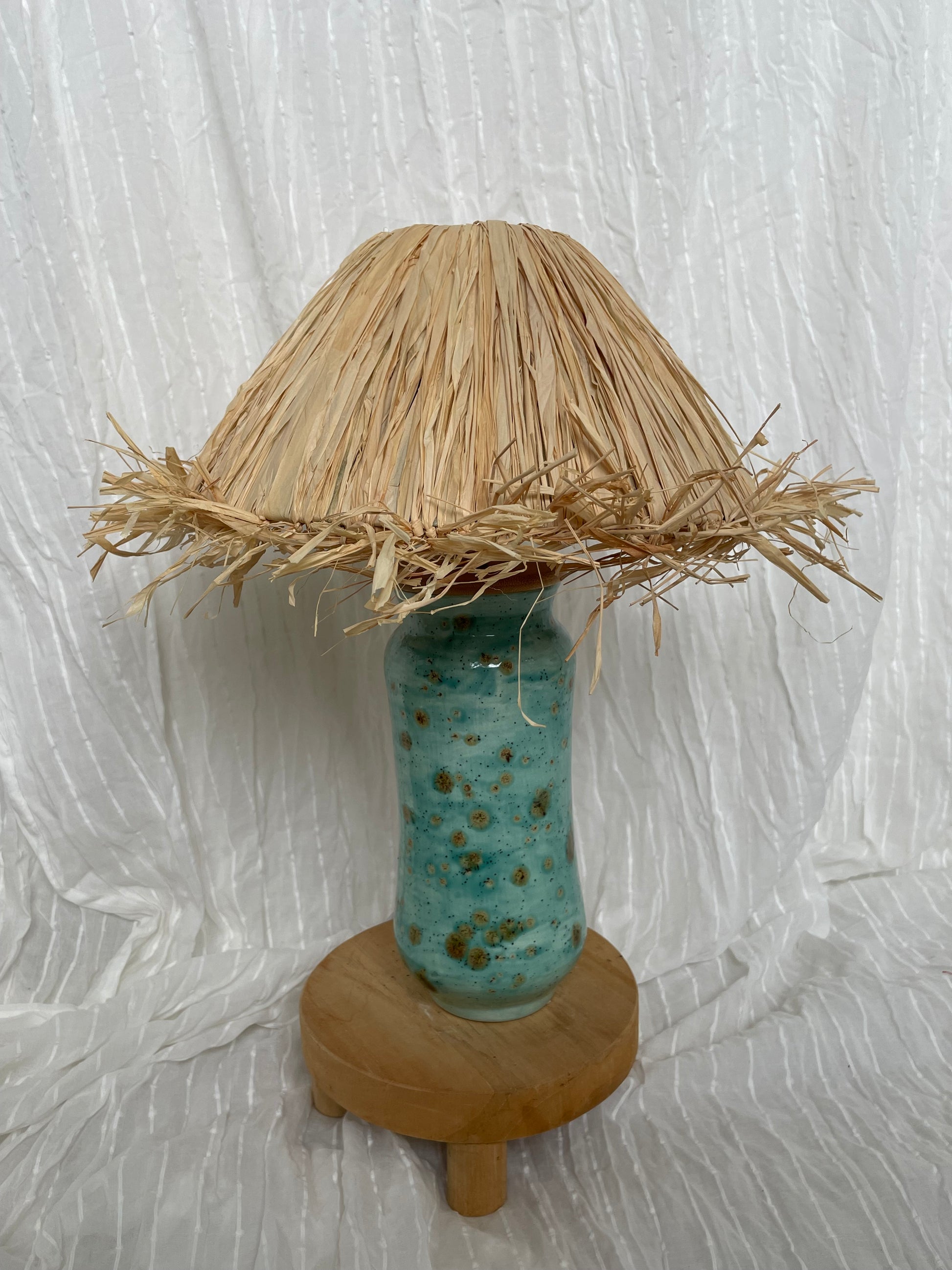 Pantalla hecha a mano nudo a nudo con rafia natural, dándole ese toque de personalidad.